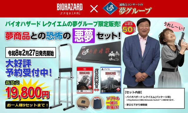「生者に恐怖を。屍者に鎮魂を。」 2月27日(金)の発売迫る『バイオハザード レクイエム』と、通販とコンサートを通じて皆様へ“夢”をお届けする株式会社夢グループのコラボレーションが実現! 待望のシリーズ最新作『バイオハザード レクイエム』と夢グループの人気商品「夢ぶら下がり健康器」を限定ボックスに収めた『恐怖の悪夢セット』を販売いたします。このセットは全世界50セット限定で本日より夢グループの公式サイト、または電話での予約受付が始まっています。