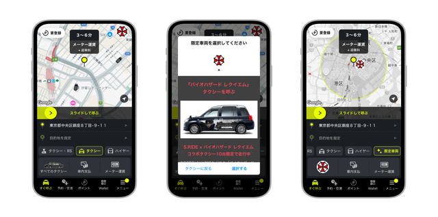 タクシーアプリ「S.RIDE」画面右上の『バイオハザード レクイエム』のアイコンをタップし、限定車両を選択することで配車可能。
