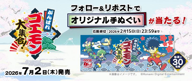 さらに、発売決定を記念し、本日よりSNSキャンペーンを開始しました。KONAMI公式Xをフォロー&対象ポストのリポストで、30名様に「がんばれゴエモン!オリジナル手ぬぐい」をプレゼントします。ふるってご応募ください。