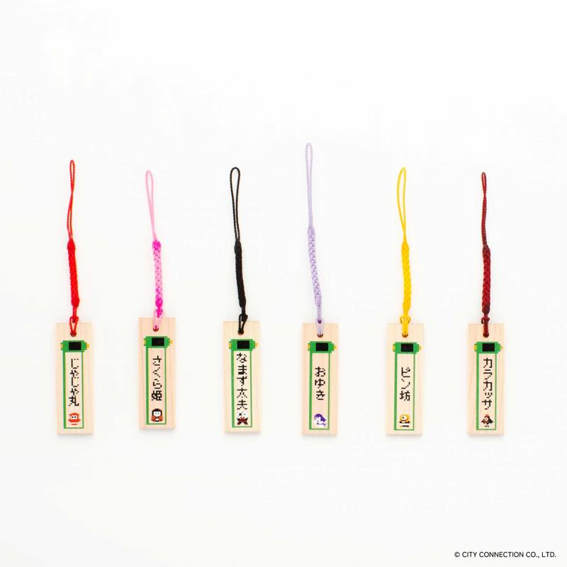 「忍者じゃじゃ丸くん」のキャラクターたちが根付紐付き木札ストラップになって登場。