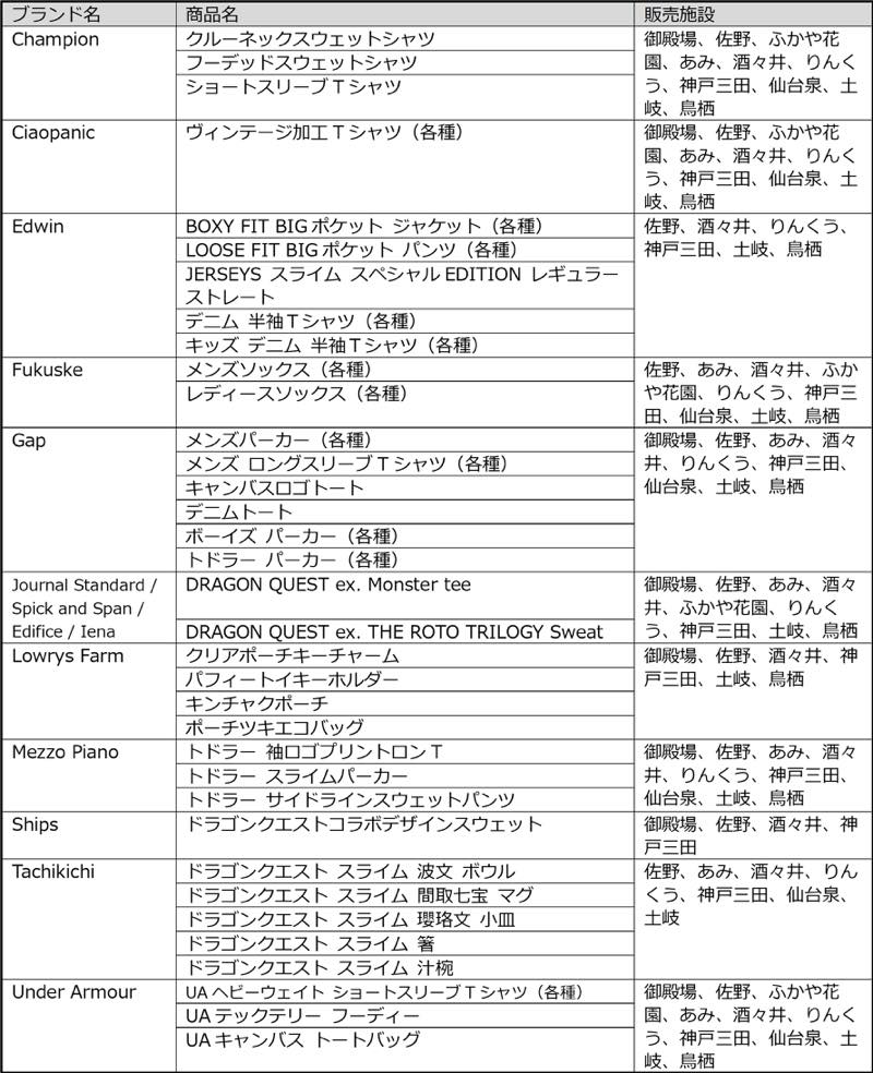 また、全国10施設で「ドラゴンクエスト どうぐや at SQUARE ENIX POP UP STORE」がオープン。「ドラゴンクエスト」シリーズを中心とした人気タイトルのオフィシャルグッズや、今回のために描き下ろした『JOIN THE QUEST!』イベントイラストのグッズも販売します。さらに、プレミアム・アウトレットに出店しているブランドが限定コラボ商品を販売。「チャンピオン」、「ギャップ」、「アンダーアーマー」などグローバルブランドから、「チャオパニック」、「ローリーズファーム」など国内ブランドまで、DQと初コラボとなる11ブランドが、多彩なラインナップでプレミアム・アウトレット限定商品を展開します。