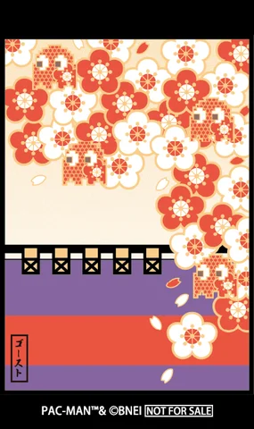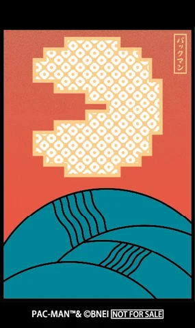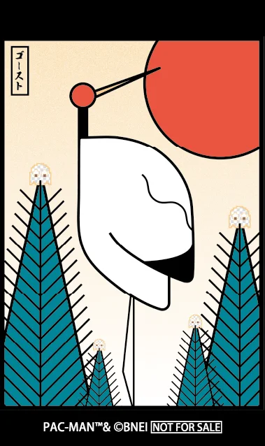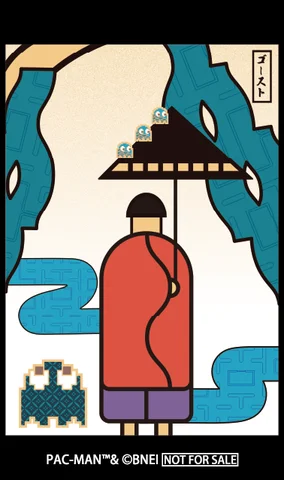 本作では、その光札にPAC-MANのモチーフを重ね合わせた。PAC-MANは光札一枚にしか存在せず、ゴーストたちは札を「ゴーストハウス」に見立てて閉じ込められている。伝統的な意匠とゲームのキャラクターが交差することで、新しい表現の広がりが生まれている。