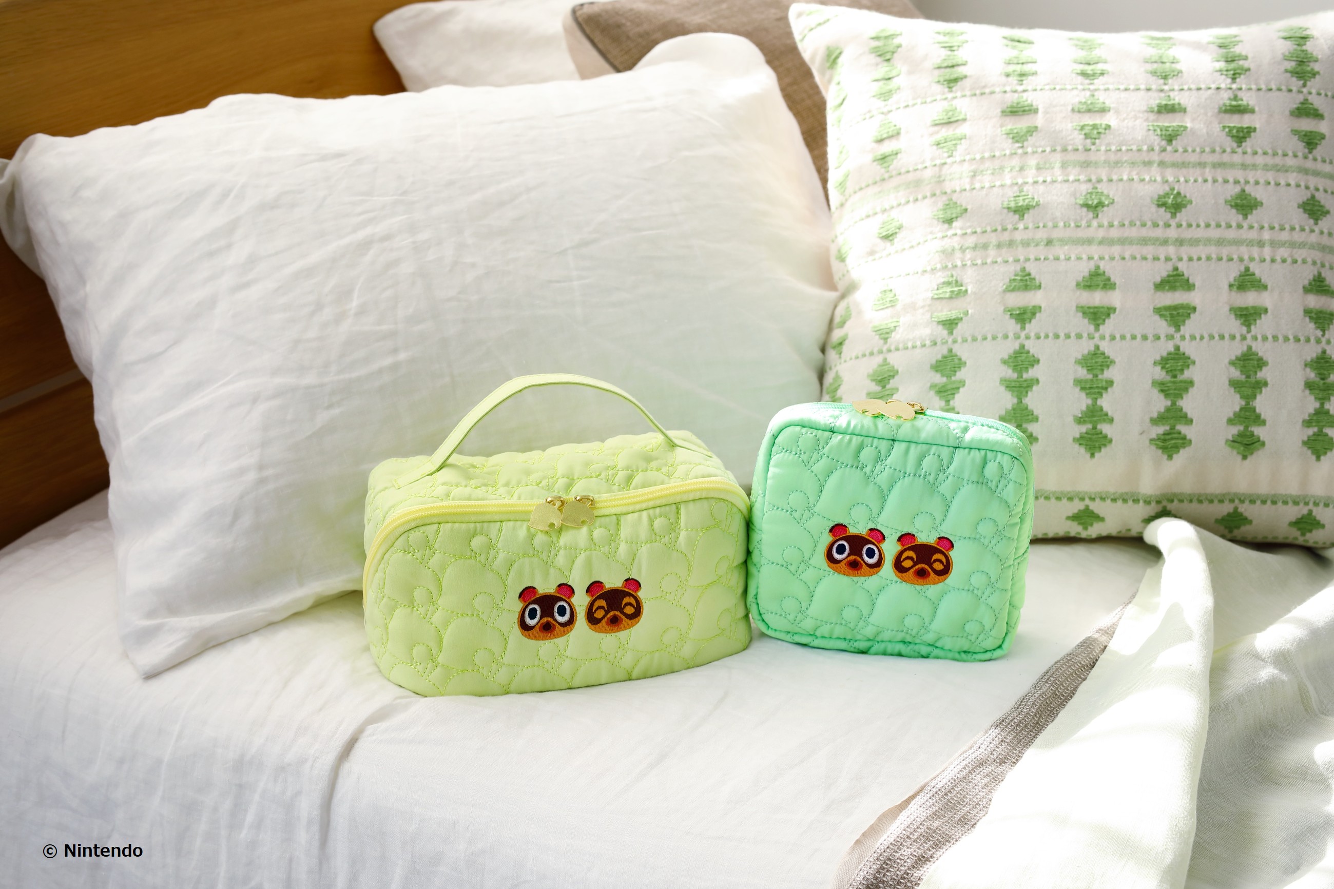 『あつまれ どうぶつの森』らしい葉っぱ柄のキルティングがポイントの春色カラーのポーチは、まめきち&つぶきちの刺しゅうをあしらい、180度にガバッと開くポーチと日常使いしやすいスクエアポーチの形・色違いで展開します。